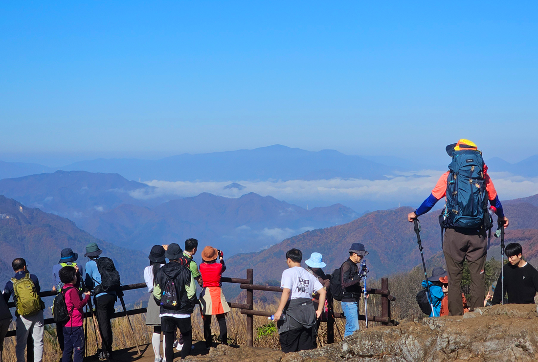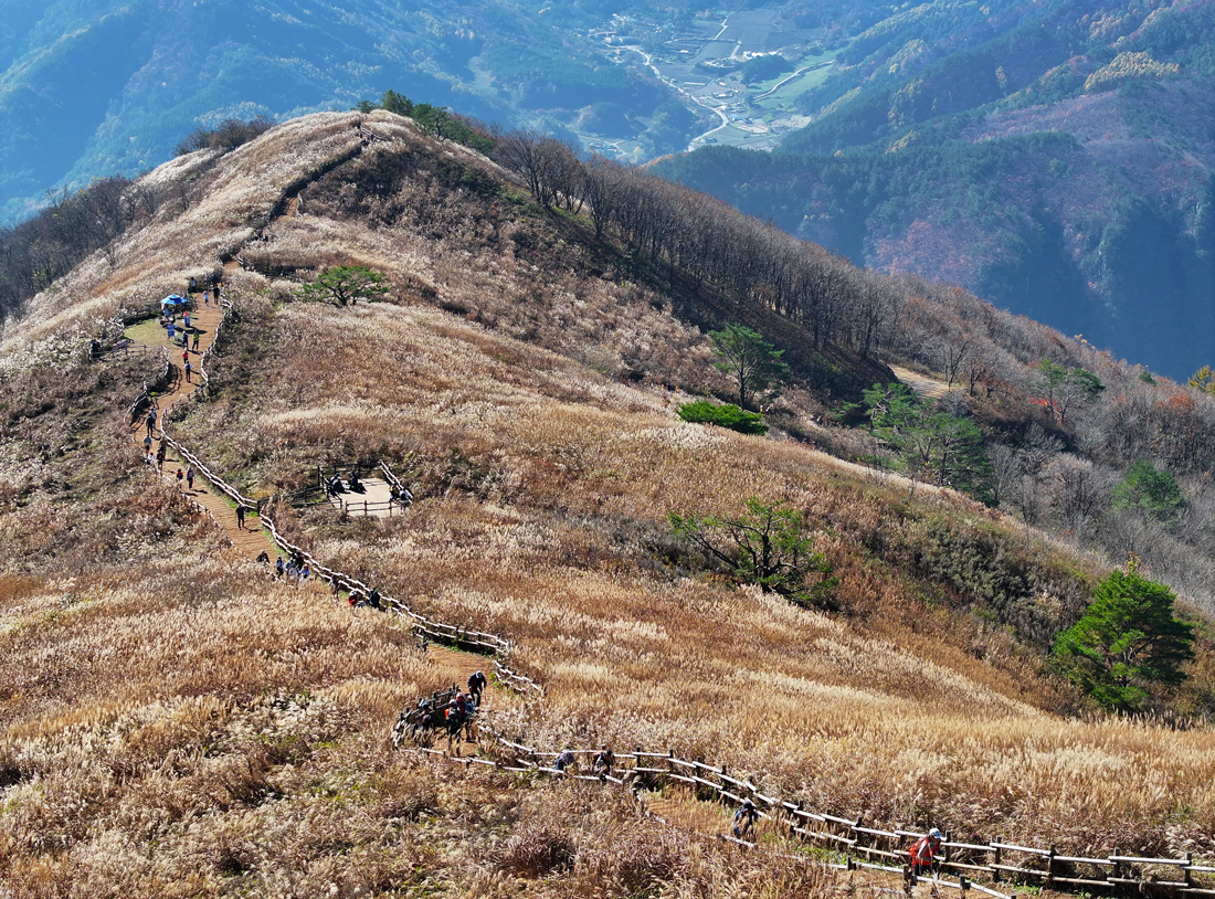 1,119m에 올라서면 억새 군락지가 장관인 곳으로 9월 24일~11월 13일까지 축제가 예정되어 있다. 10월 중순~11 월 초순이 가장 아름다운 시기다. 나무가 자라지 않아서 민둥산이라 불렀다는데 석회암으로 이루어져 있다. 가을 억새로, 설경으로도 주목을 받았고 석회암이 빗물에 쉽게 녹으면서 표면이 웅덩이처럼 들어가 조성된 돌리네(doline)가 신기한 자연현상으로 알려지면서 봄과 초여름에도 찾는 사람들이 늘었다.