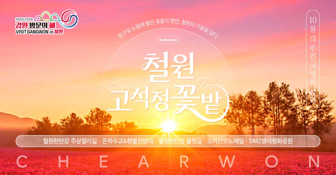 가을 개장은 지난 8월 27일에 시작해 오는 11월 2일까지 계속 이어진다. 해마다 가을만 아니라 사계절 화제를 모으는 곳이지만, 가을에 더 주목받는 이유는 역시 붉고, 노랗고, 각양 각색의 색깔을 보여주는 색의 향연에 있다. 본지에서도 매해 빠지지 않고 청보리와 유채꽃 코스모스 십 리 길을 소개했다. 한탄강을 옆으로 두고 23만여 m²의 부지에 만들어진 과거 군사 훈련장의 재생 공간으로 성공적인 경관 사업으로 꼽힌다. 철원 9경의 하나로 고석정도 둘러 보고 한탄강 유네스코 세계지질공원에서 생산하는 농특산물을 살 수 있는 ‘오늘의 농부’ 코너도 있다.