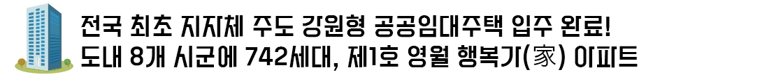청년층‧신혼부부 맞춤형 특화 설계, 시세 대비 저렴한 임대료 제공 등 차별화된 장점을 갖고 있는 영월 행복가(家) 아파트는 1층에 청년창업 지원 공간인 식당과 편의점 등 근린생활 시설을 배치해 생활과 일자리가 공존하는 복합형 구조로 설계, 주거와 창업이 결합한 정착형 주거 모델로 평가받았다. 도비 40억 원을 포함 총 사업비 298억 원, 지상 18층 102세 대 규모로 건립됐다.