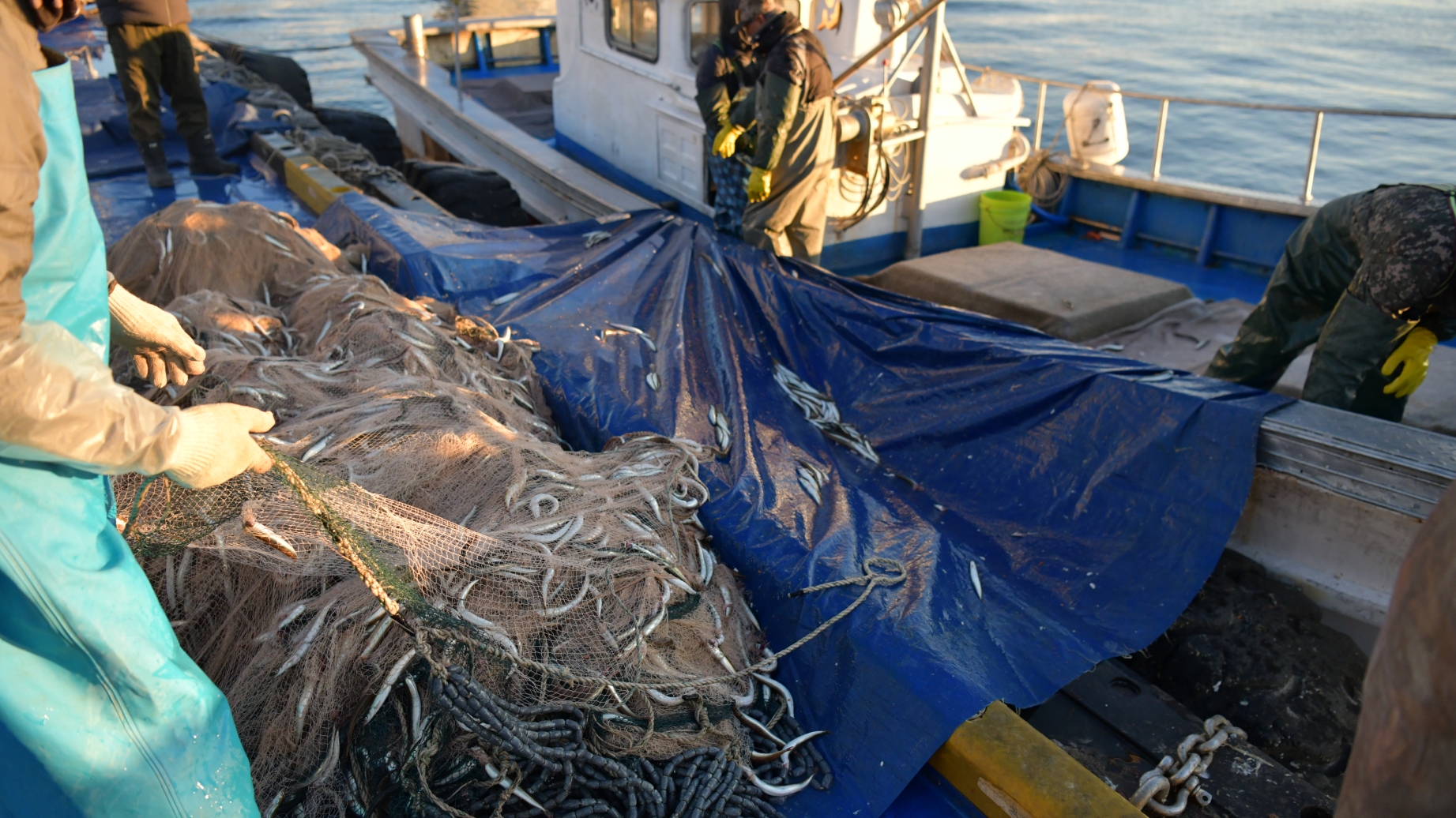 어부들의 손끝, 그물 속에 한가득 몽글몽글한 양미리가 물을 튀기며 모습을 드러냅니다.