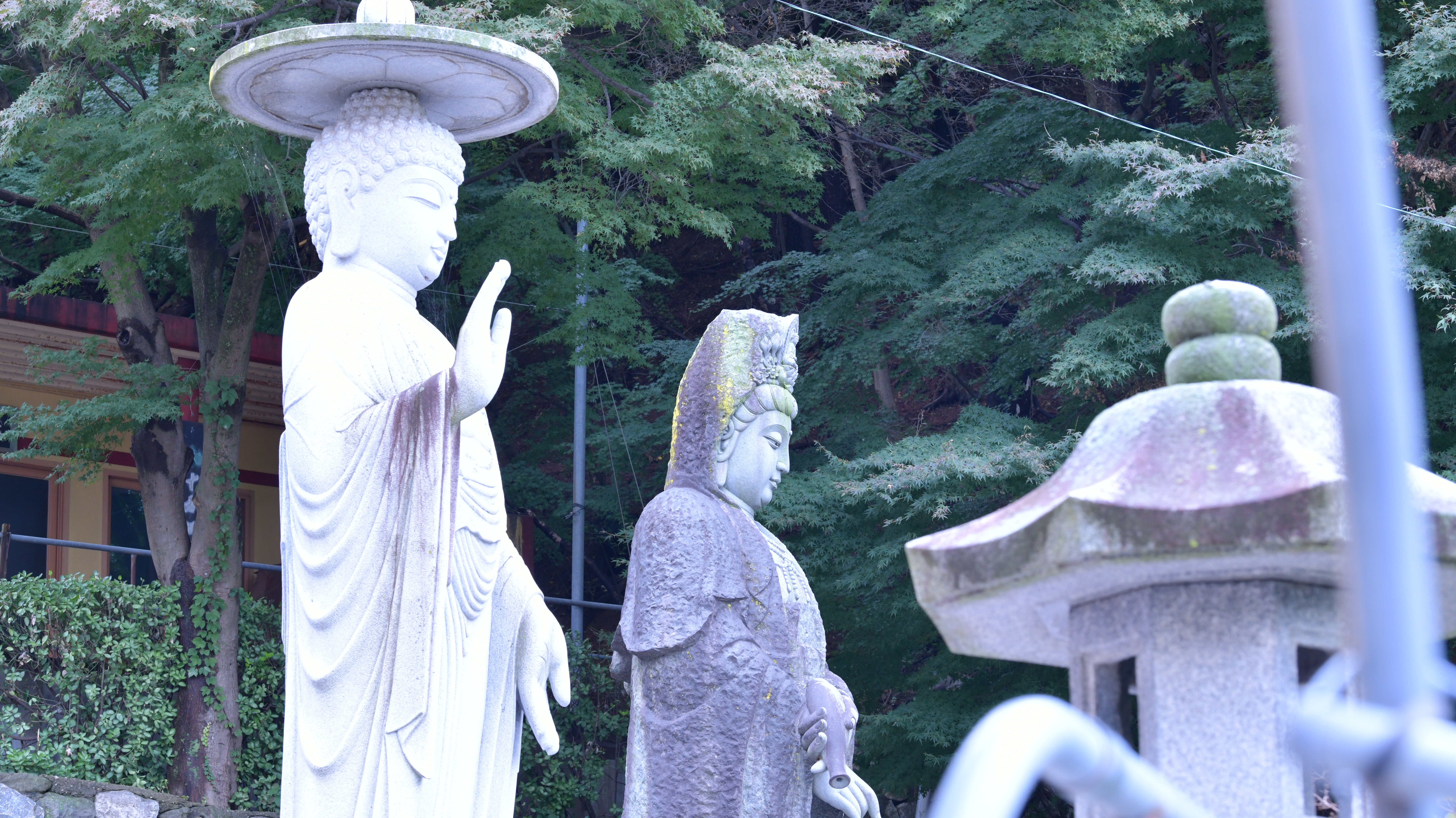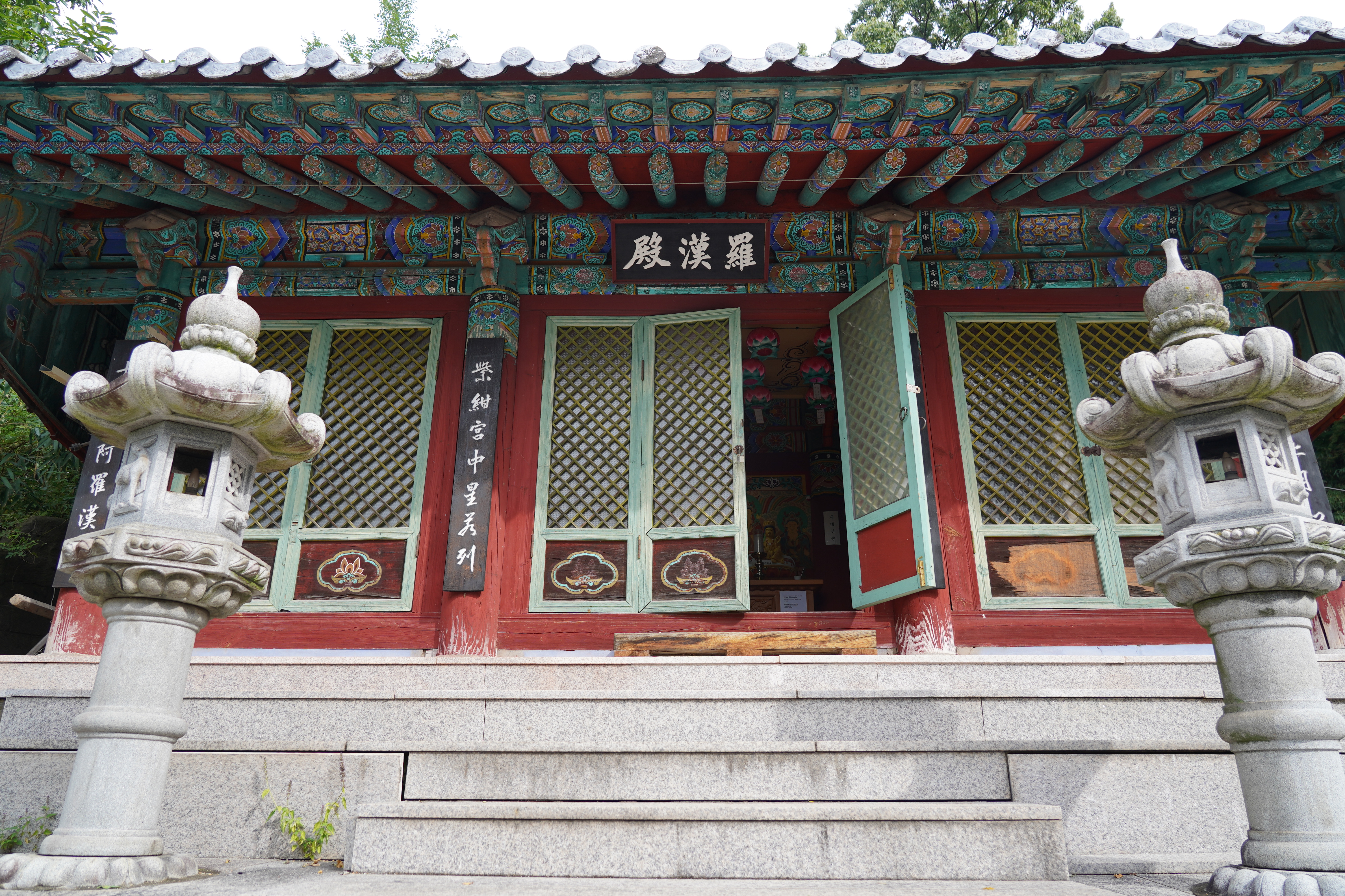 사천왕상이 굳건히 지키는 금강문으로 향하는 길목 오른편으로 거대한 미륵불상, 해수관음상, 지장보살상이 자비로운 미소로 중생들의 입당을 반기는 듯하다. 절로 경건해지는 마음으로 경내에 들어서자 오래된 석탑 뒤로 대웅전이 위엄 있게 자리한다. 단층의 법당 안에는 아미타여래삼존상(1960)이 좌정해 있고, 그 앞으로 승려와 불자들이 정성 들여 읊는 아침 불경 소리가 공간을 가득 채운다.