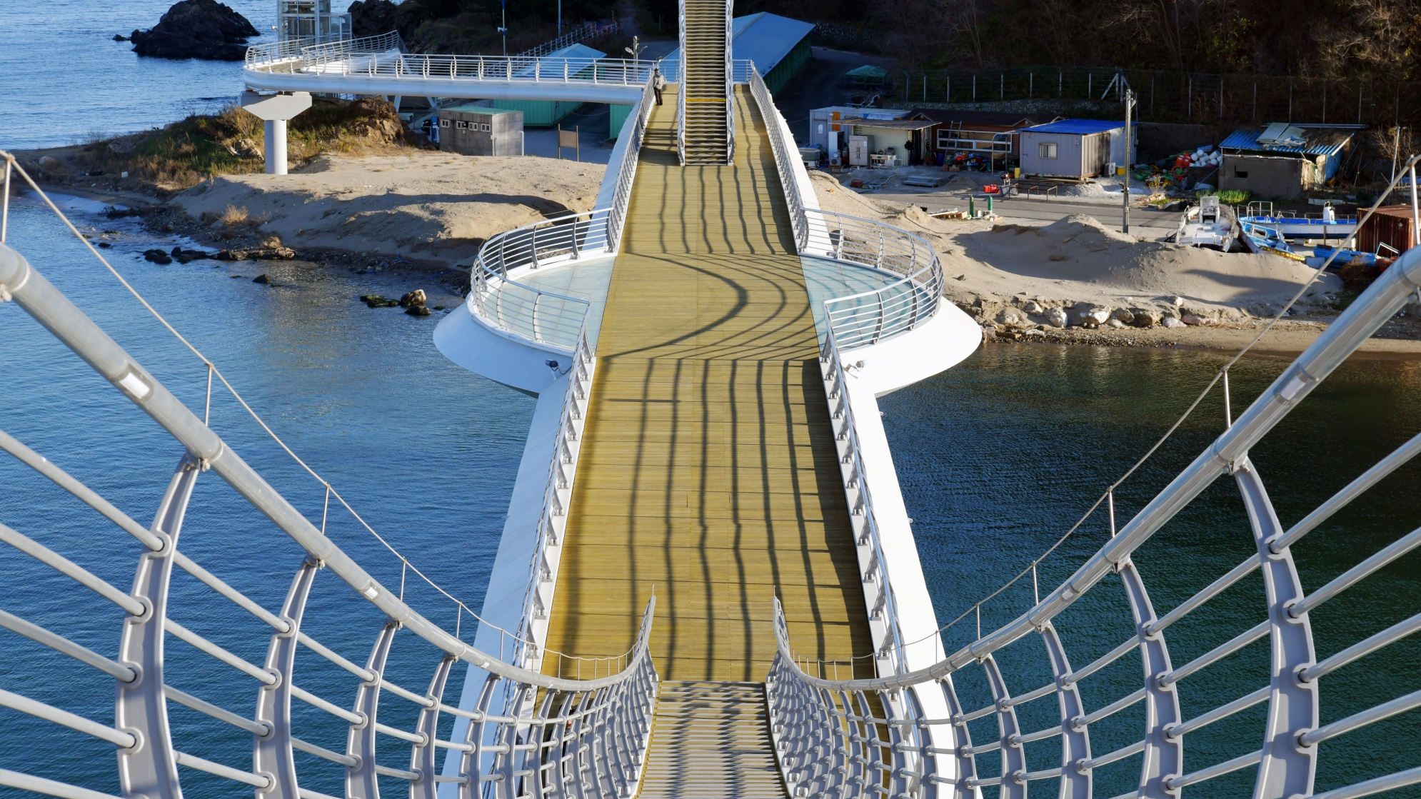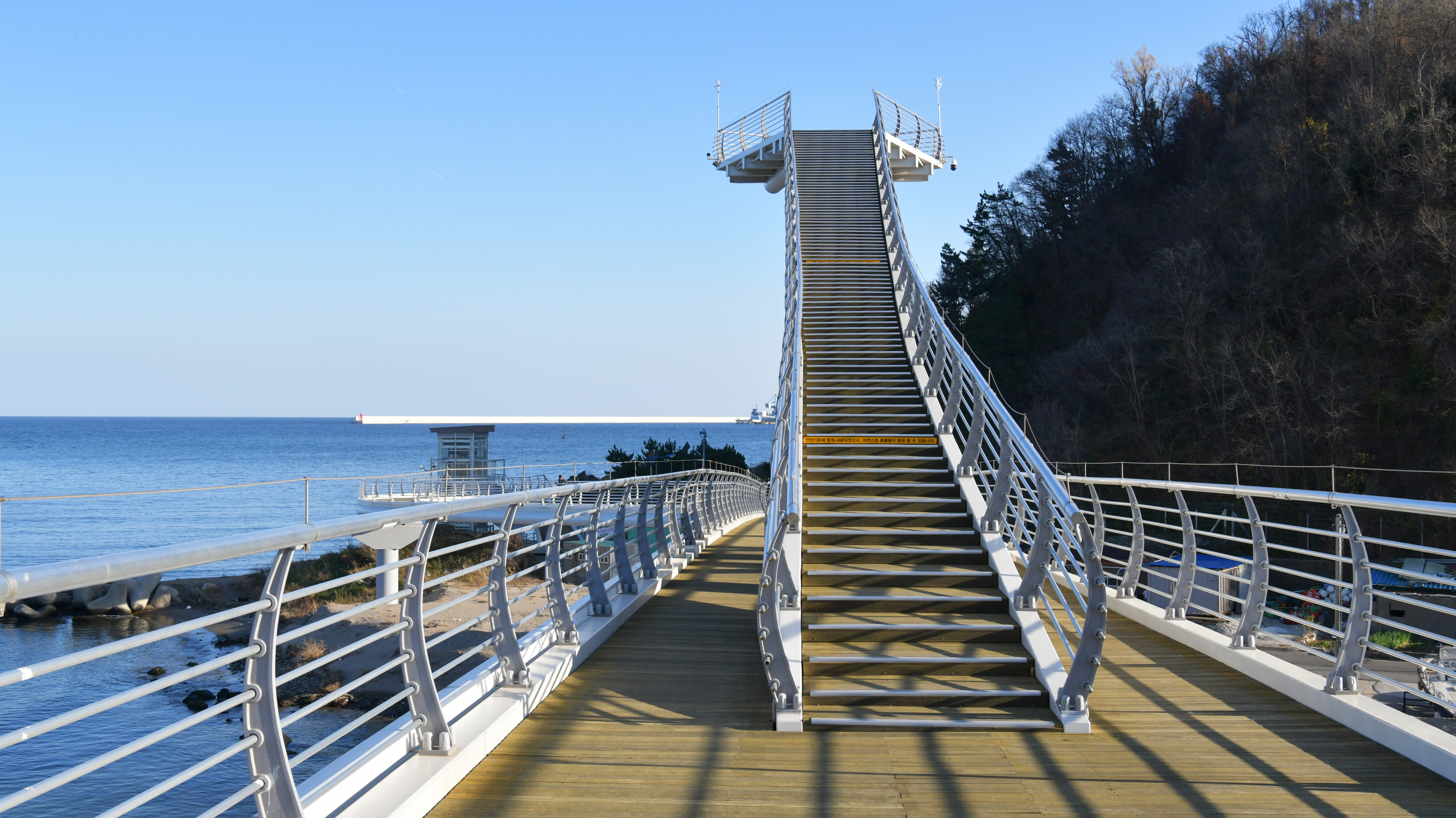 다리 위에 대칭 구조로 설치된 두 개의 전망대에 오르면 삼척의 풍경이 더욱 극적으로 펼쳐진다. 망망 동해의 수평선, 오십천 하구의 시멘트공장 산업 지구, 정라동의 구릉 능선, 저멀리 태백산맥까지. 한눈에 담기에도 모자른 풍광이 시원하게 360도 파노라마로 펼쳐진다. 안전기준에 맞춰 설계된 다리가 삼척 특유의 강풍이 불어올 때면 미세하게 살살 흔들리며 짜릿한 스릴까지 선사한다. 바람과 함께 걷는 특별한 체험이 걸음마다 신선하게 느껴진다.