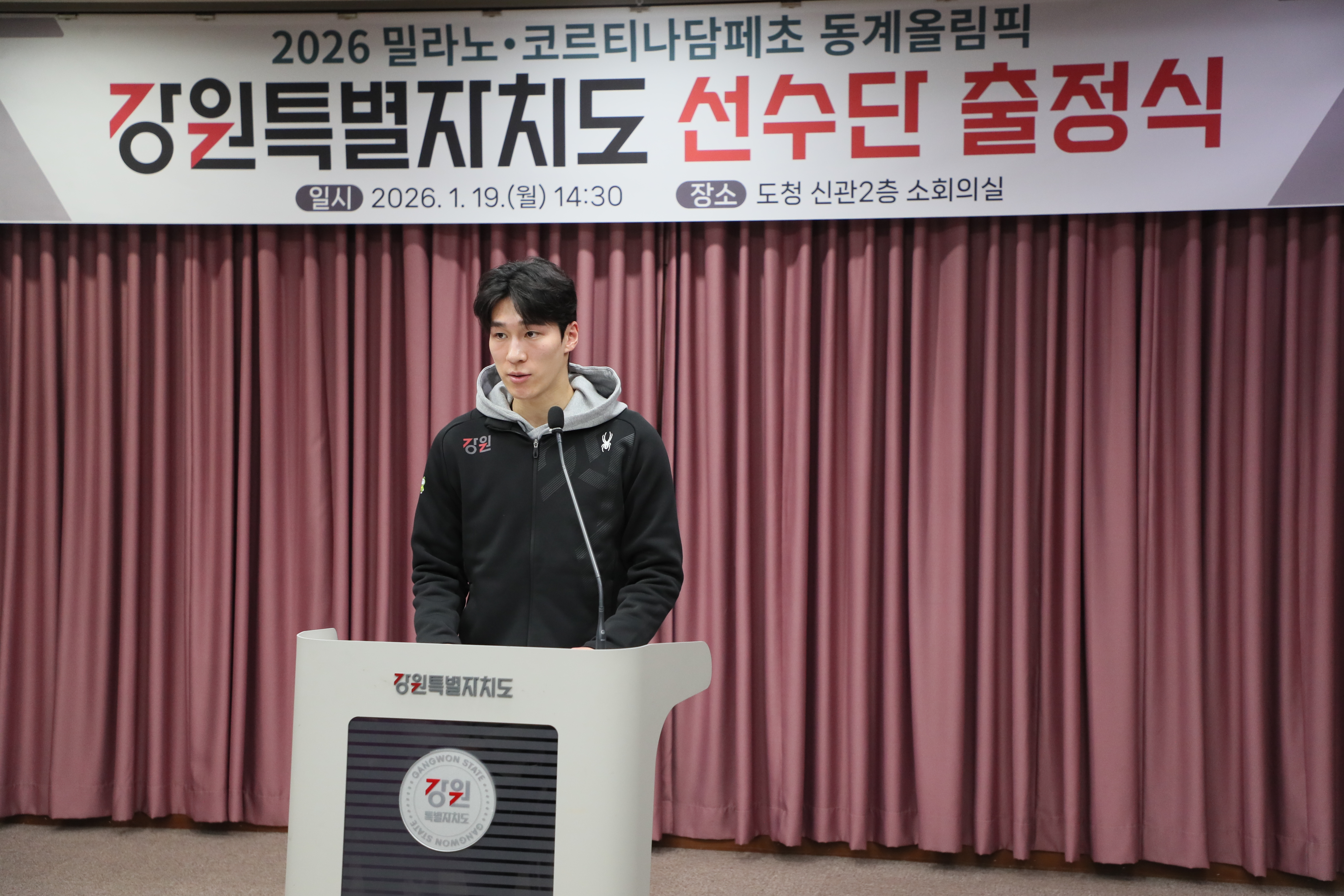 한편 강원특별자치도는 지난 1월 19일에는 도청 신관 소회의실에서 2026 동계올림픽 도 선수단 출정식을 열어 선수단의 선전을 응원했다. 쇼트트랙 황대헌 선수를 비롯해 스피드 스케이팅, 스켈레톤, 봅슬레이 선수단과 지도자가 참석, 선수 대표로 나선 황대헌 선수는 “강원특별자치도 선수단이라는 책임으로 훈련장에서 쌓아온 시간과 노력을 경기장에서 결과로 보여드리겠다.”라고 각오를 밝혔다.
