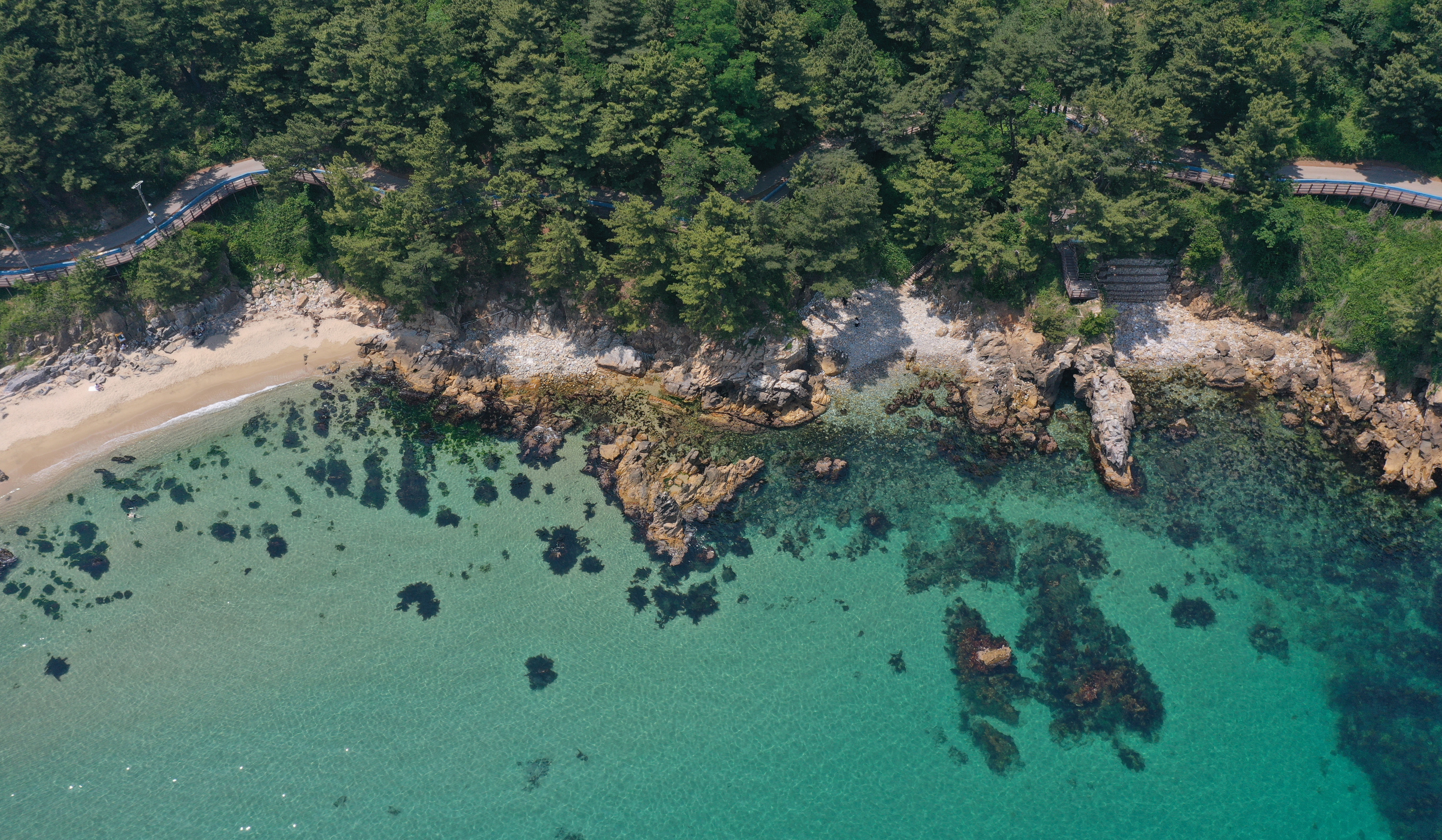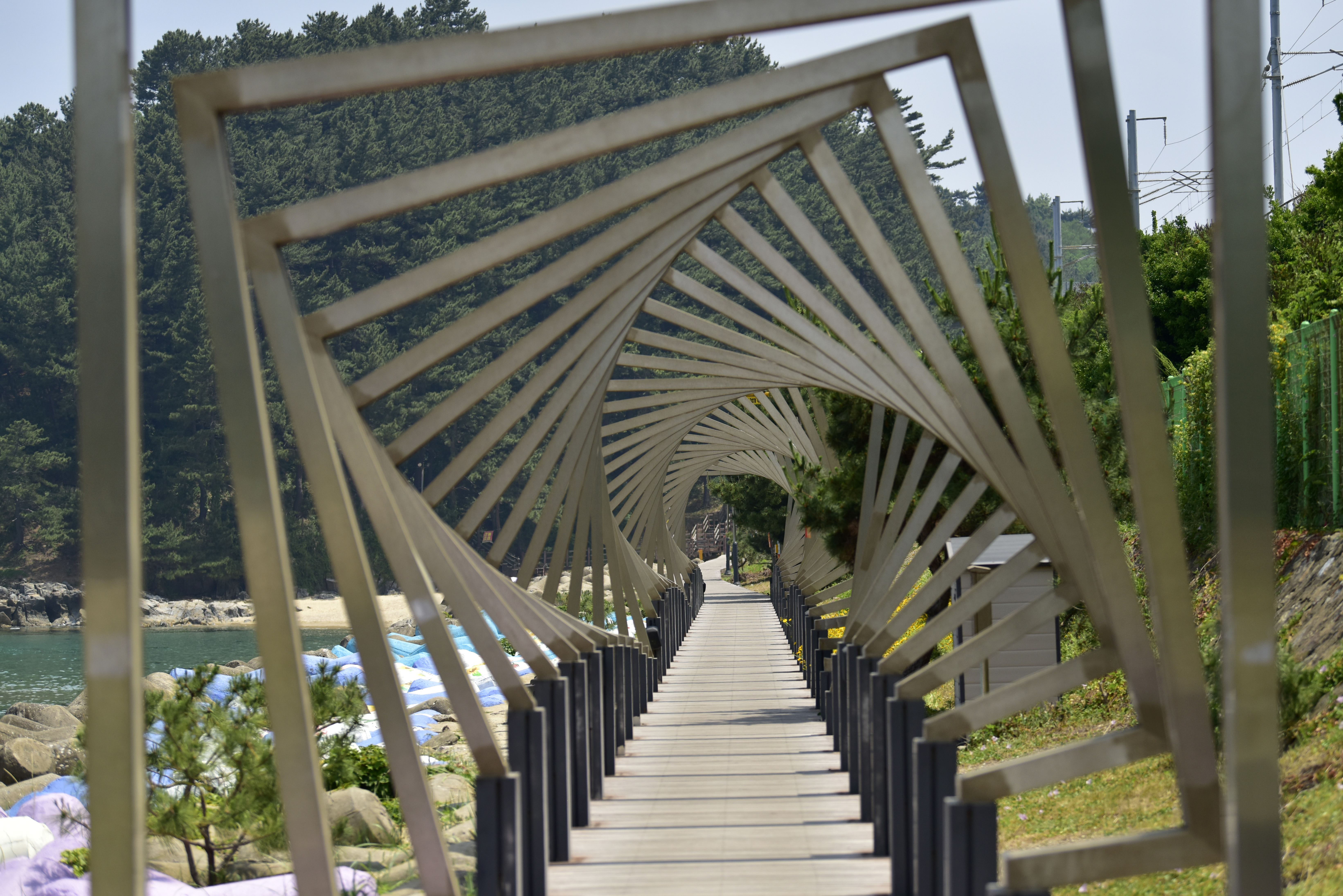 ▶ 동해 한섬감성바닷길. 드물게도, 파도 소리에 부딪히는 몽돌 소리를 들으면서 걷는 몽돌해변이 동해에 있다. 바로 한섬. 인근 천곡동굴에서 내려온 지하수가 흘러와 한여름에도 물이 얼음처럼 차가워 ‘한 寒’, 바다 섬만큼이나 아름다워 ‘섬’이라 불린단다. 이목을 집중시키는 야간 조명 터널 리드미컬 게이트와 뱃머리 전망대 사진이 인터넷에서 회자하면서 감성 바닷길이라는 명칭을 부여받았다.