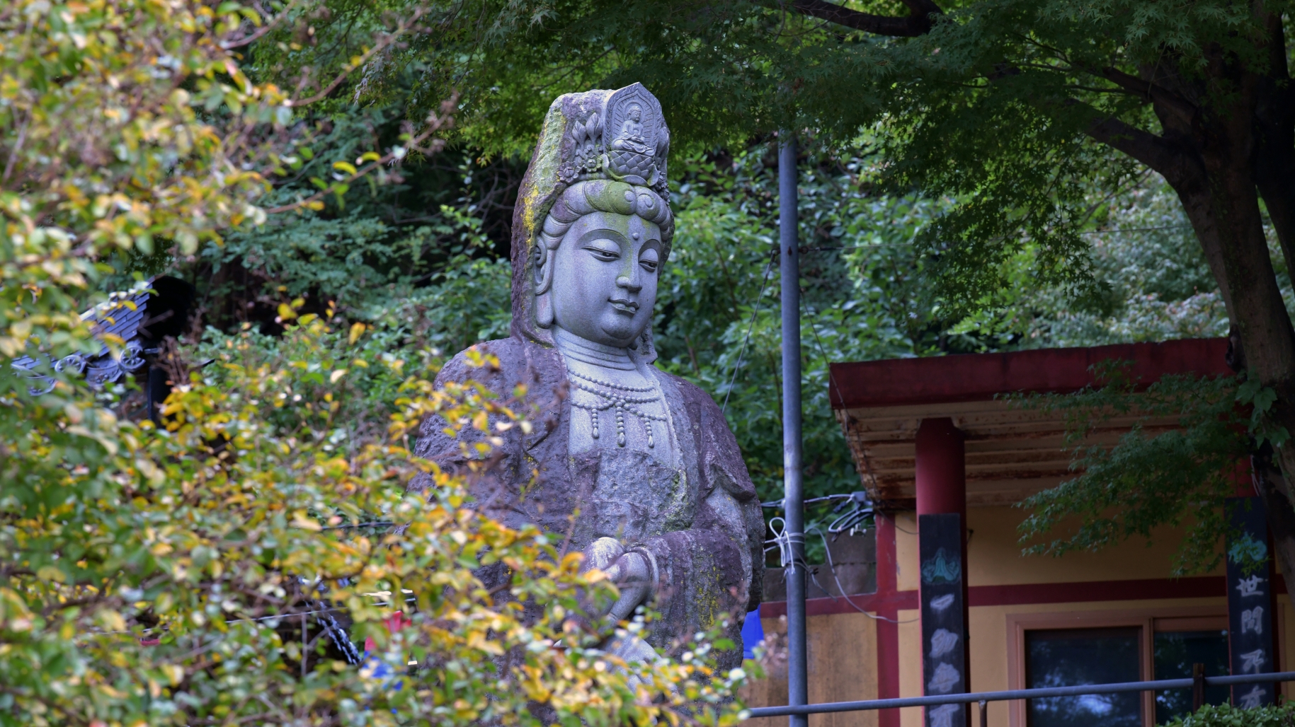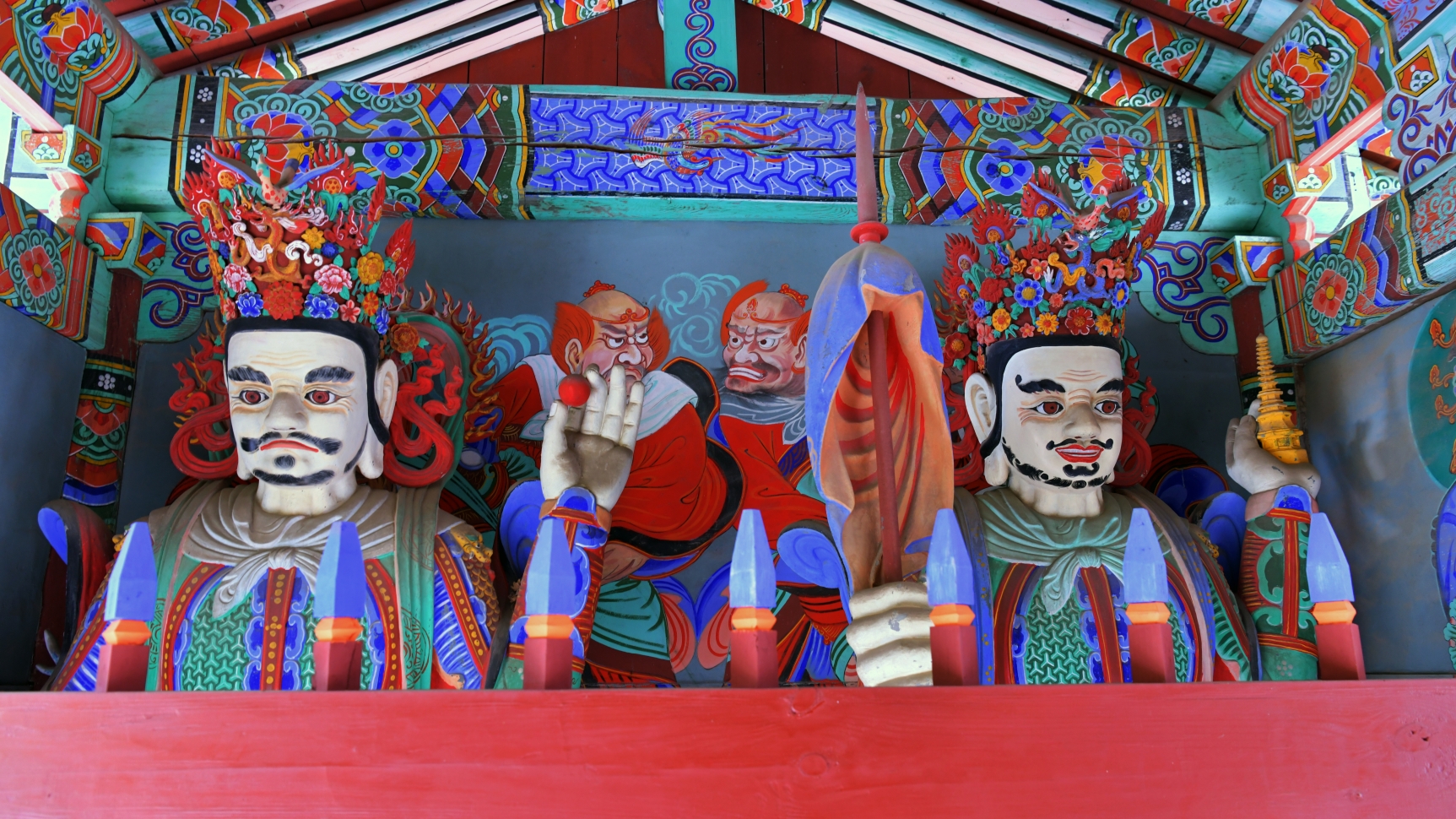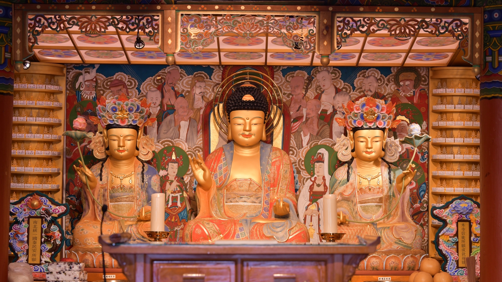 사천왕상이 굳건히 지키는 금강문으로 향하는 길목, 오른편으로 거대한 미륵불상, 해수관음상, 지장보살상이 자비로운 미소로 중생의 입당을 반기는 듯하다. 절로 경건해진 마음으로 경내에 들어서자 오래된 석탑 뒤로 대웅전이 위엄 있게 자리한다. 단층의 법당 안에 아미타여래삼존상(1960)이 좌정해 있고, 그 앞으로 승려와 불자들이 정성 들여 읊는 아침 불경 소리가 공간을 가득 채운다.