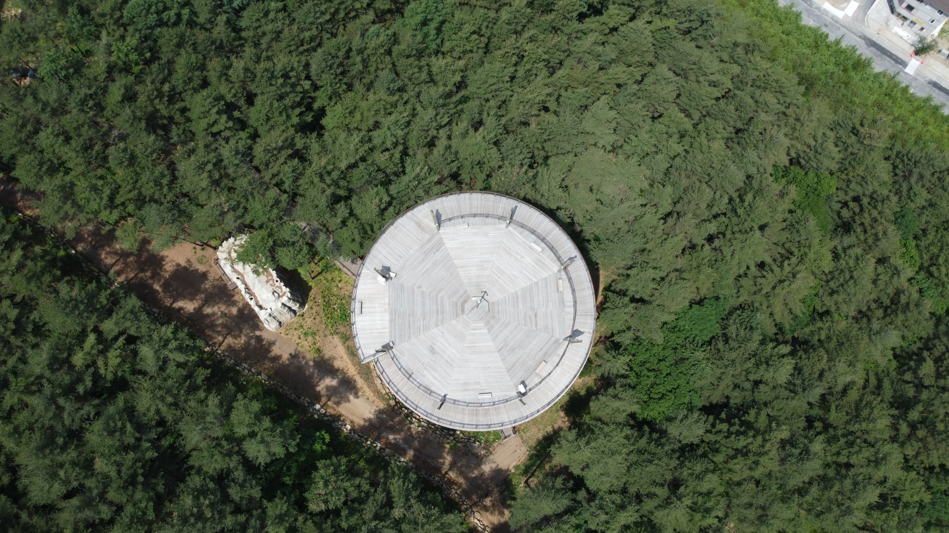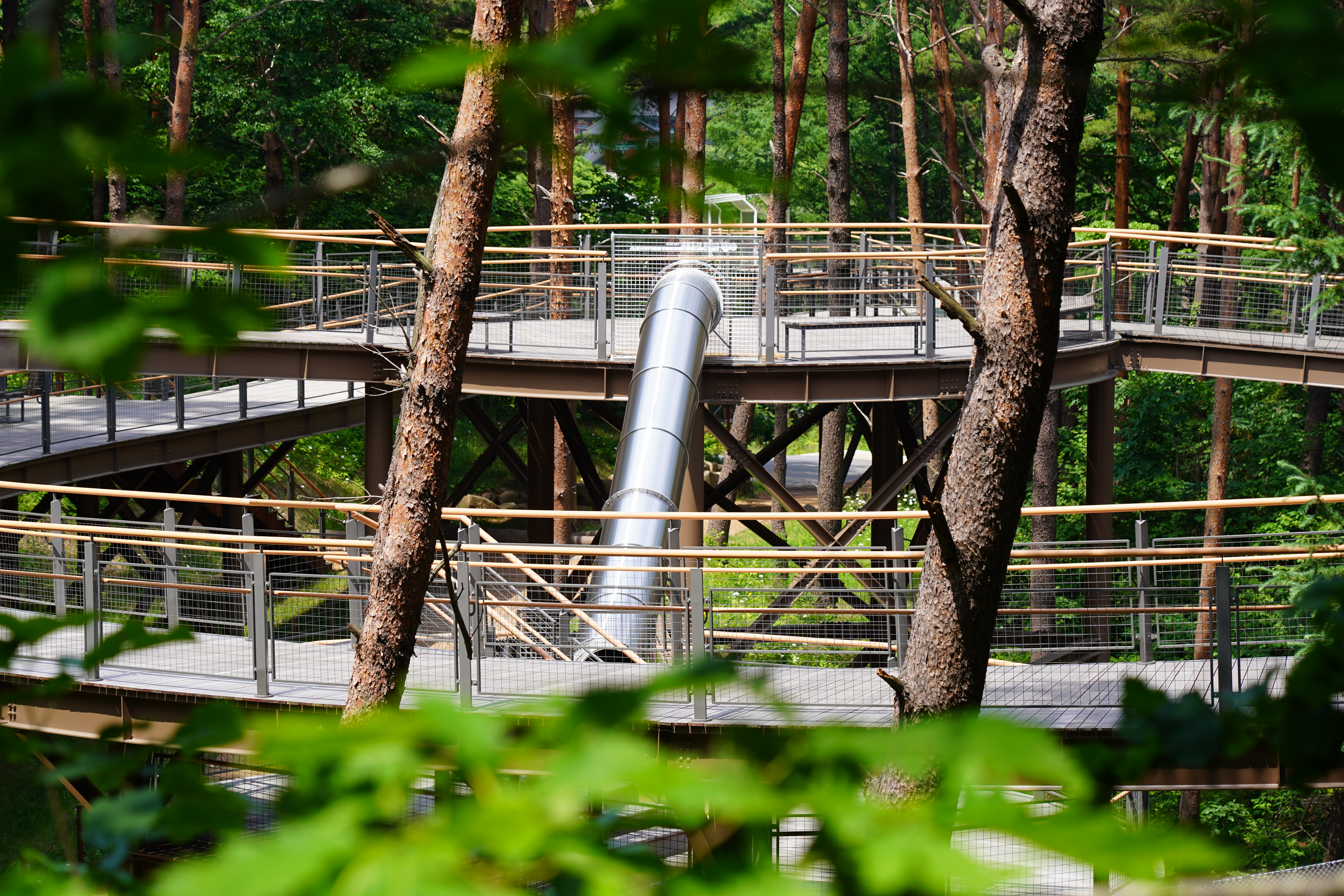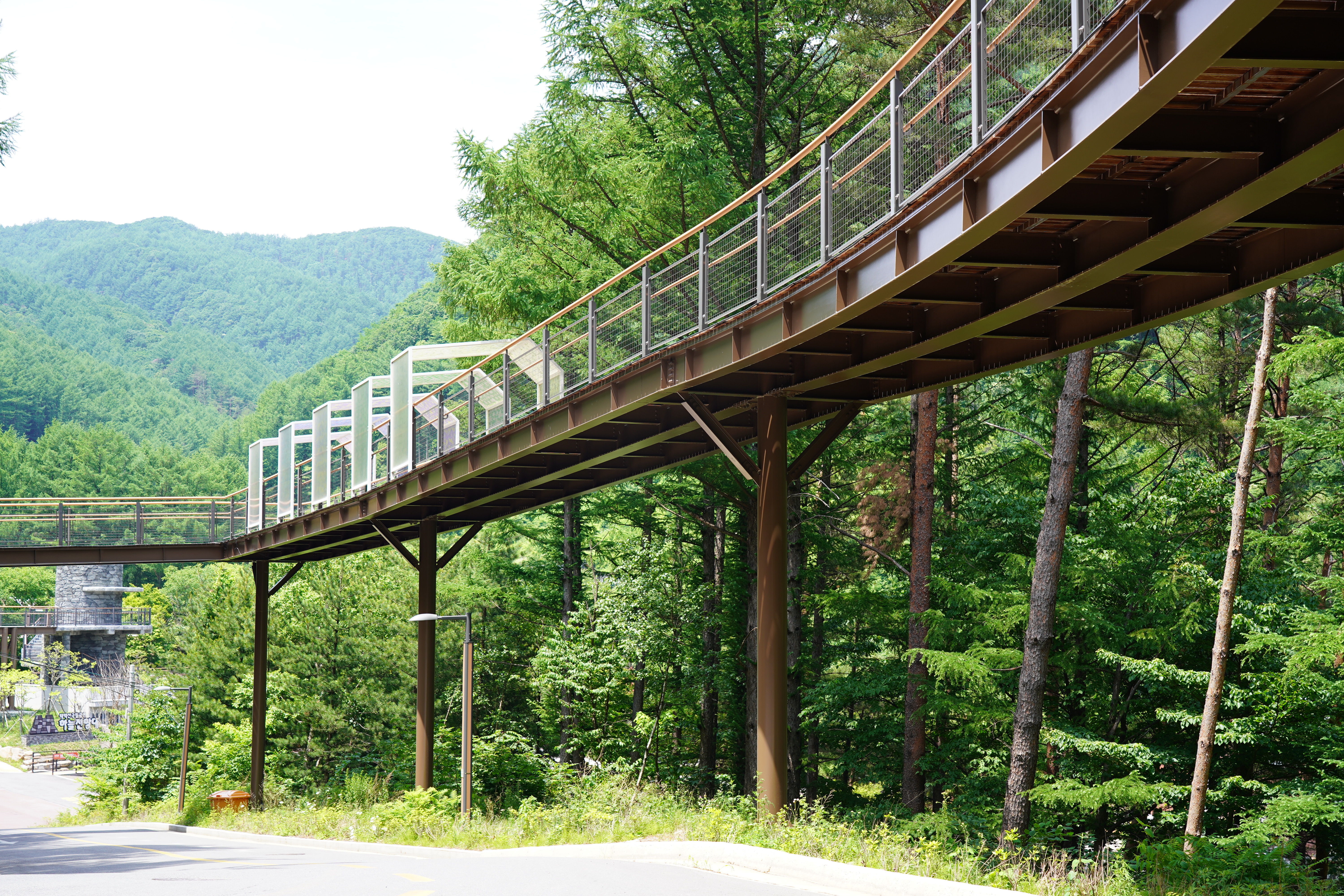 초입이라는 말이 무색하게 고산지대에서 느낄 수 있는 청량한 공기가 가슴 깊이 스며든다. ‘저게 뭐지’ 한마디씩 툭툭 건네고 가는 등산객들. 지난 2024년 5월, 태백산 품속에 새롭게 둥지를 튼 ‘하늘전망대’로 향하는 430m의 나무 덱 길이 눈길을 끈다. 태백산에 오르기 전 관문처럼 지나는 당골탐방지원센터에서 12m 높이의 상공에 길게 늘어선 무장애 탐방로는 3.6도의 완만한 경사를 그리며 숲의 허공을 가로지른다.