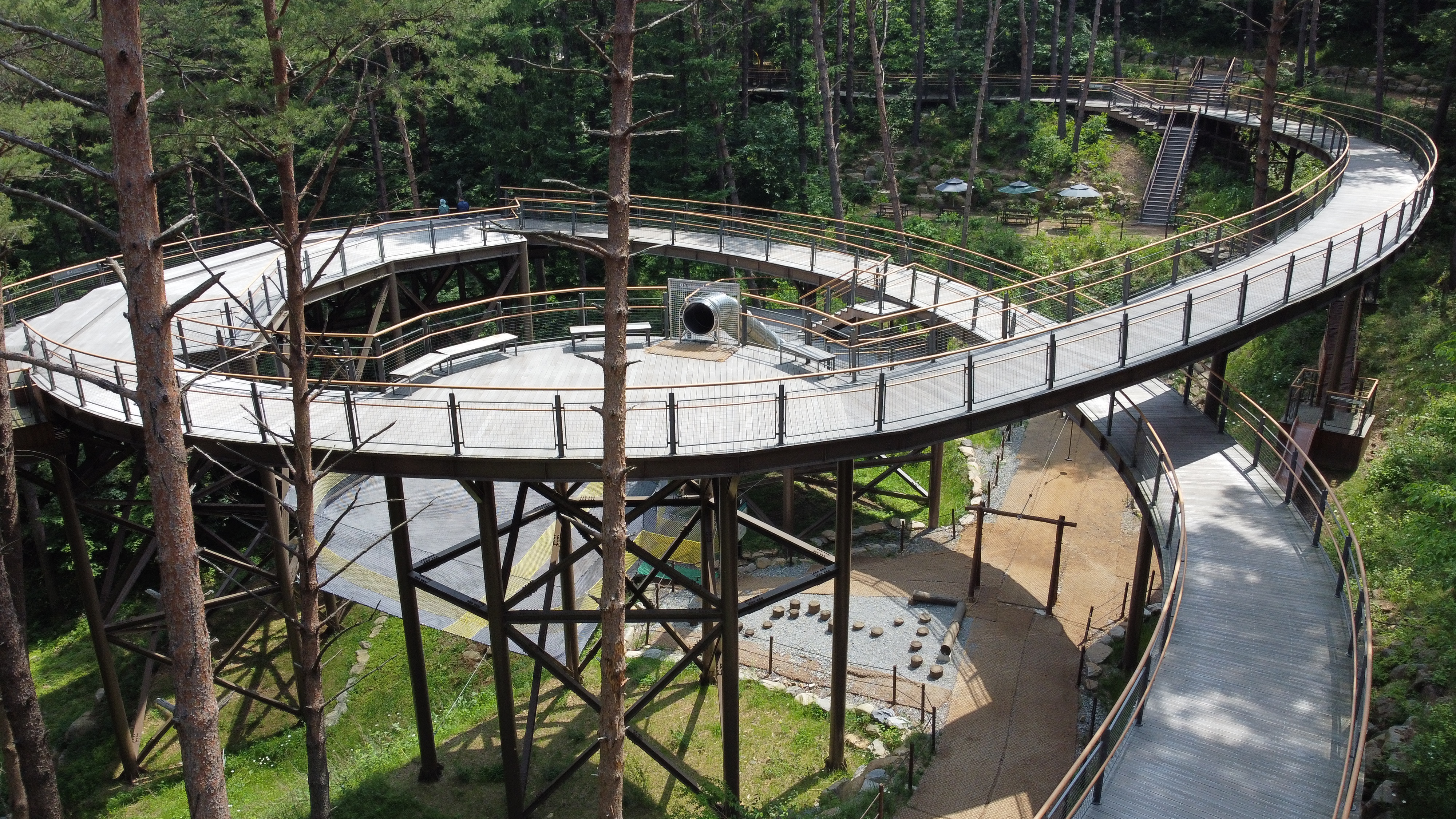 멸종위기종인 ‘날개하늘나리’ 꽃을 형상화한 33m 높이의 타워는 그 자체로 하나의 예술작품 같다. 빙글빙글 회랑을 따라 걸음을 옮기면, 마침내 끝없이 넘실대는 초록 물결과 마주한다. 등산하지 않고도 고도 863m에서나 볼 수 있는 태백산 능선이 360도 파노라마로 눈앞에 펼쳐진다.