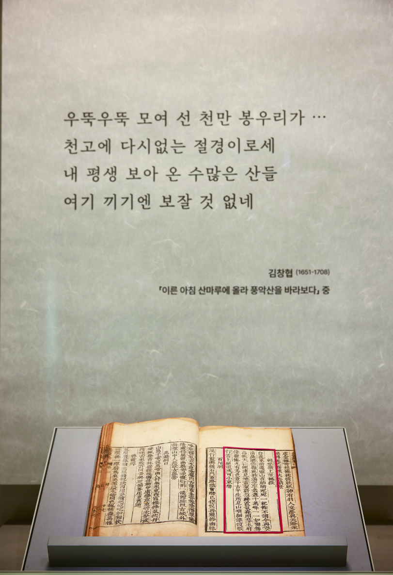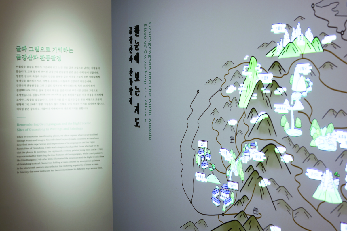 조선부터 근대까지, 강원 최고 명승지 ‘금강산과 관동팔경’을 찾은 이들이 남긴 글·그림·지도·사진으로 그곳을 상상해 볼 수 있다. 금강산 풍경을 선명하게 전한 17세기 문인 김창협의 글을 모은 ‘농암집’, 그곳의 명소를 자신만의 시각으로 포착한 19세기 화원화가 김하종의 그림이 수록된 ‘해산도첩’, 20세기 초 금강산 안내지도와 사진엽서까지 전시품이 다채롭다. 옛 사람들이 그곳에서 ‘보고 느낀 것’과 ‘보여주고 싶은 것’이 시대와 매체에 따라 어떻게 달라졌는지를 자연스럽게 이해할 수 있도록 꾸민 전시실이다.