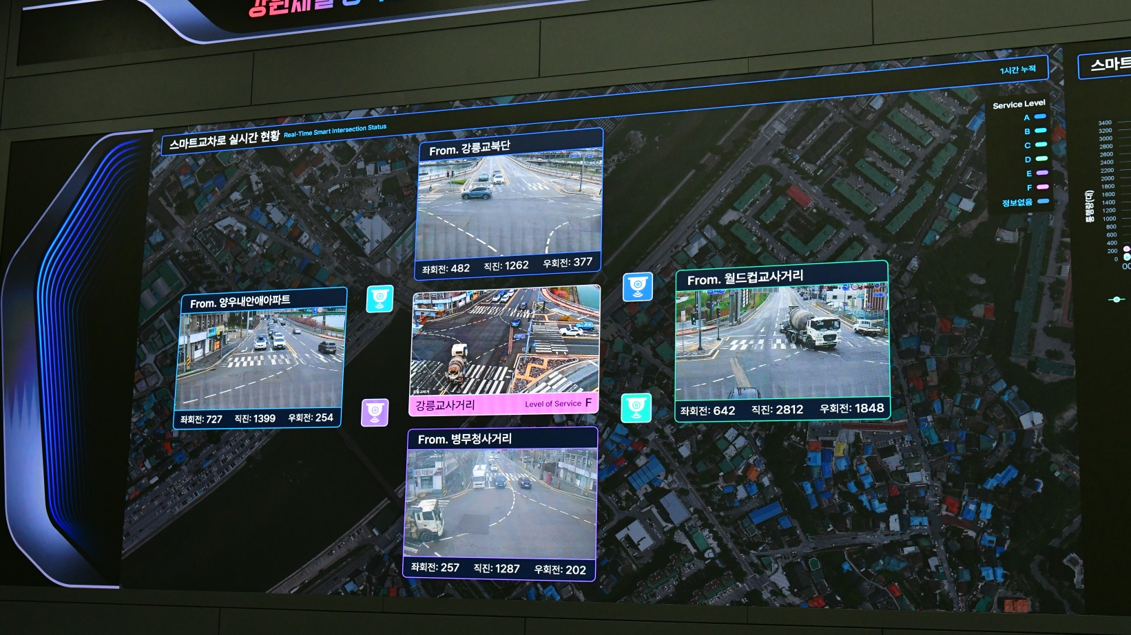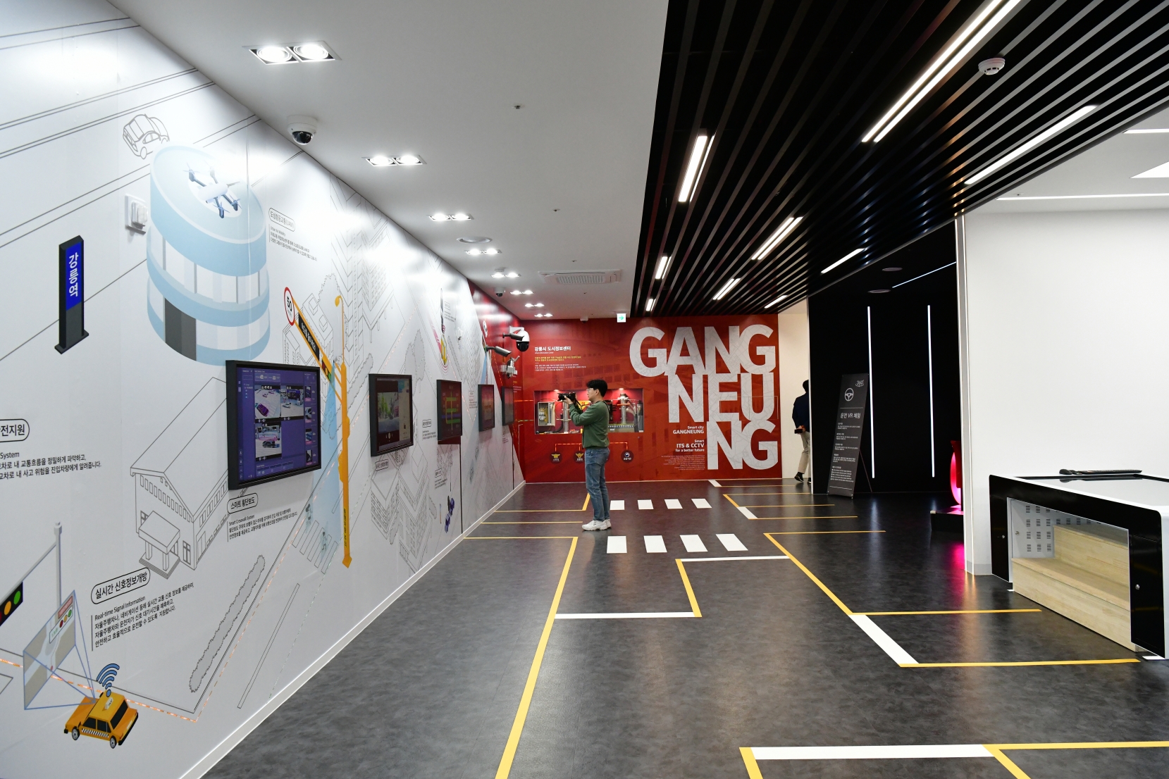 2층 통합관제실 문이 열리자, 벽면을 가득 채운 초대형 상황판이 가장 먼저 시야를 압도한다. 상황판 위로 시 전역에 설치된 3,229대의 CCTV가 전송하는 고화질 영상과 차량흐름 데이터가 쉴 새 없이 명멸한다. 24명의 전문 관제 인력이 4조 3교대로 24시간 상주해, AI와 지능형교통체계 기술을 바탕으로 최적화된 신호 개방과 교통량 분산, 방범, 재난 대응 등 스마트 도시의 컨트롤 타워 역할을 묵묵히 수행한다. 1층은 ITS 정책과 기술에 대한 이해증진을 위한 전시관으로 꾸며졌다. 강릉의 지능형 교통체계를 소개하고 첨단 교통 기술을 직접 체험할 수 있는 다채로운 콘텐츠들을 전시해, 연간 3천 5백여 명이 찾고 있다.